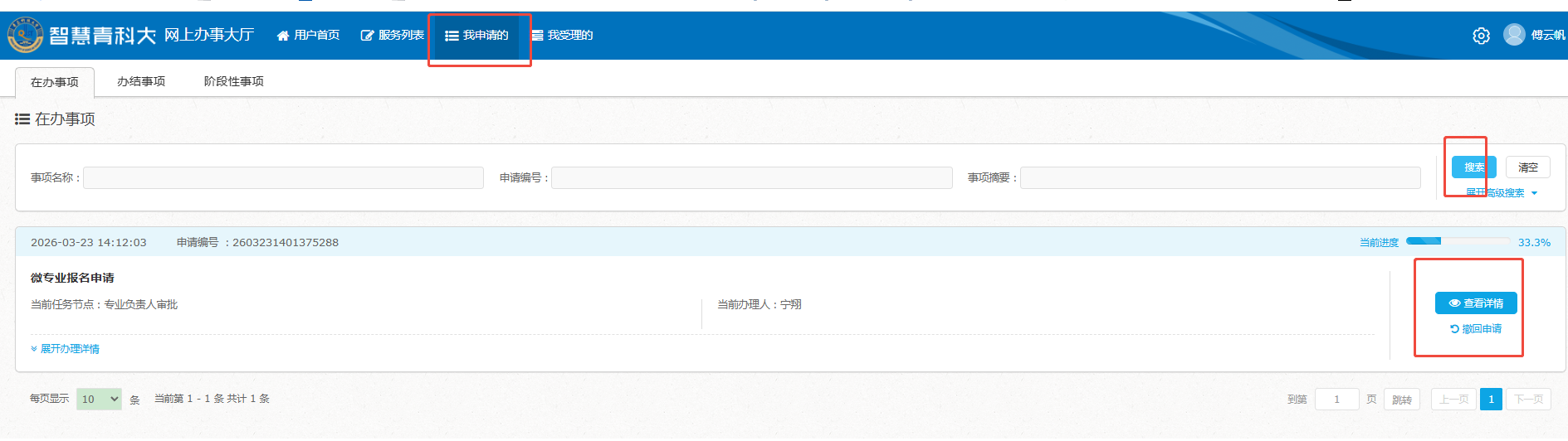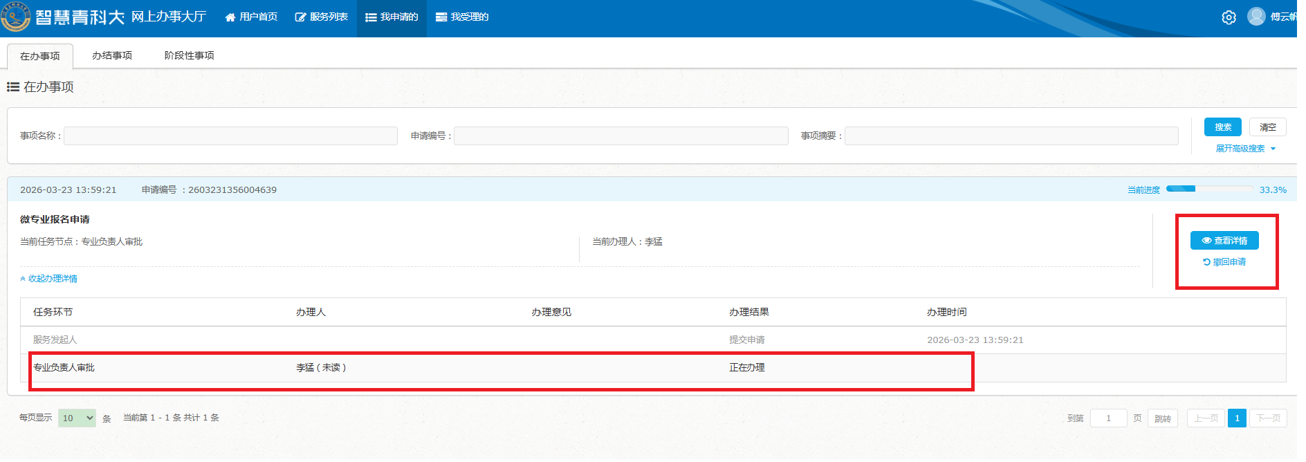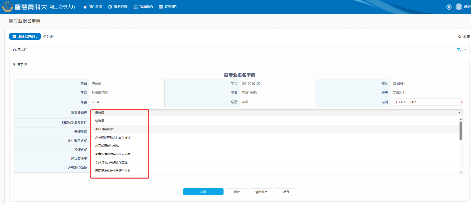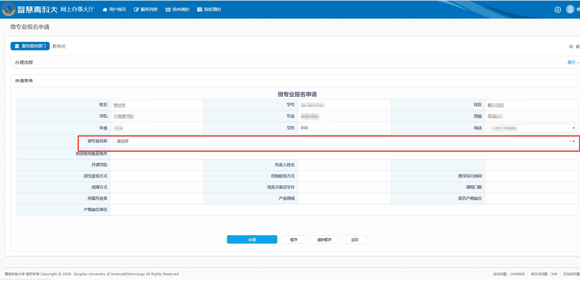 3、报名后,如需要报多个微专业,可从“智慧青科大”主界面——办事大厅——微专业报名申请,重新进入报名界面,再申请另外的微专业。