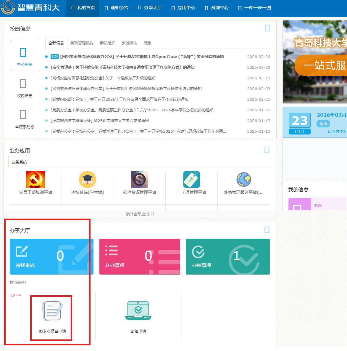 1、登录“智慧青科大”,在最下方的办事大厅模块,找到“微专业报名申请”,点击进入。推荐使用Google、360浏览器,不支持QQ浏览器。