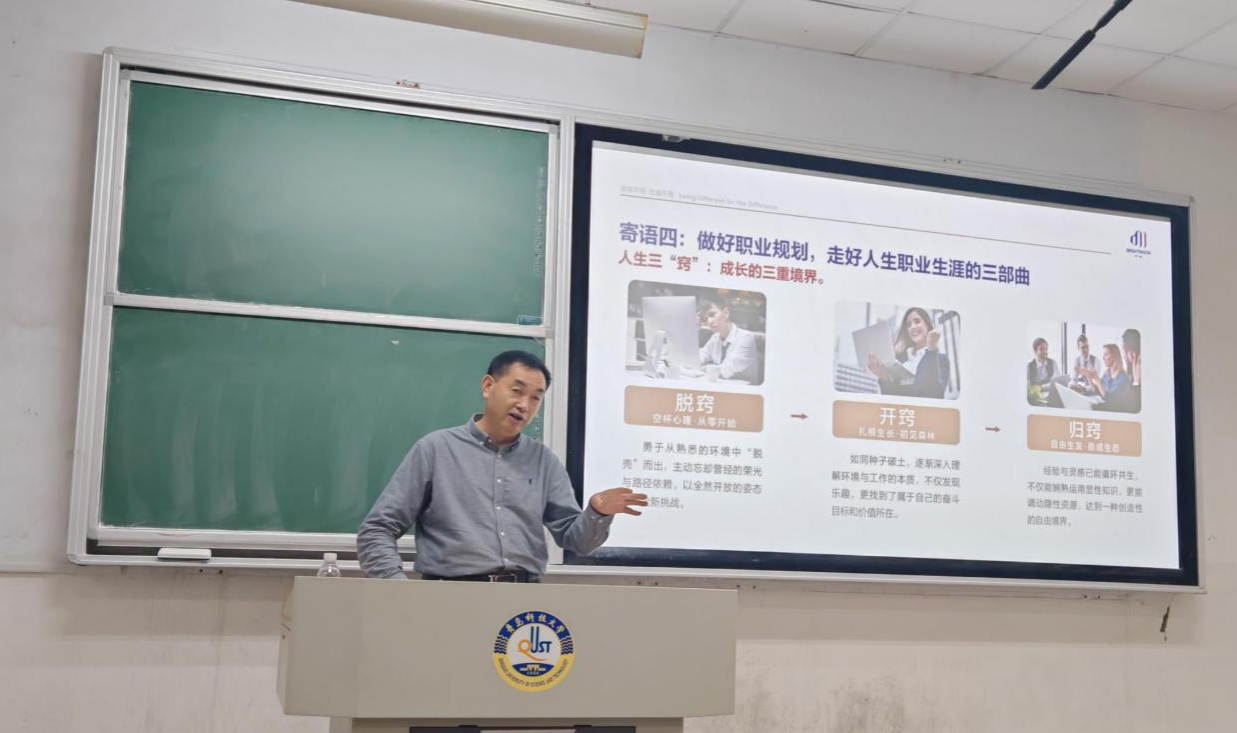 张国防以《一棵海藻做成一个健康大产业——明月集团发展与职业思维养成》为题,生动讲述了明月集团从国内首批海带制碘企业起步,到“深耕蓝海”迈向世界第一的传奇发展历程。他着重从战略领先、文化引领、创新驱动、组织保障、品牌赋与开放合作等六个维度,系统阐述了企业高质量发展的核心路径,并分享了企业未来发展的战略布局。在课程最后,他结合自身创业与管理实践,向学生们提出五点殷切寄语:一是要有跃进式的思维;二是理论与实践相结合,工作现场有灵魂,实践才是硬道理;三是三人行必有我师,多拜师、多交流;四是做好职业规划,走好人生职业生涯的三部曲;五是做一个对社会有价值的人。
