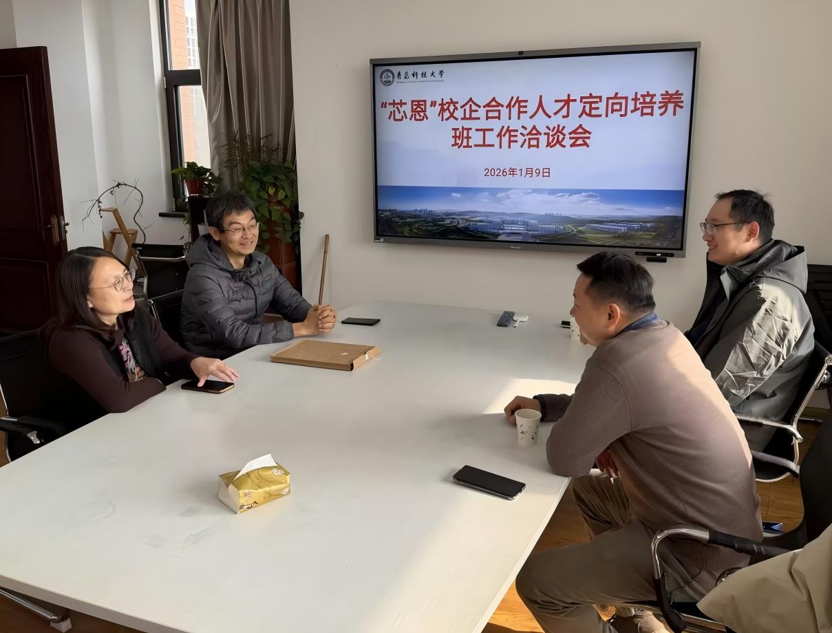 近日,芯恩(青岛)集成电路有限公司企业代表来校交流。教务处处长马翠萍、教务处楚晓东教授参加座谈,校企双方围绕人才定向培养班新一年的合作事宜开展友好磋商,夯实后续合作基础。