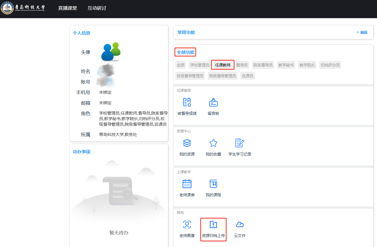 【学校首页→智慧青科大→应用中心→业务应用→青科云学堂→点击右上角工作台→全部功能(选择任课教师)→资源归档上传】,如下图所示。