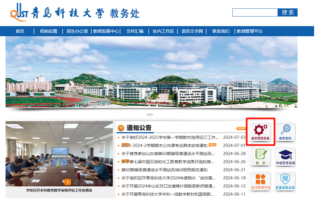 学生进入青岛科技大学教务处网页,点击“教务管理系统”(见下图红框处),输入学号及密码,登录系统后,点击“教学评价→学生评价”,即可逐一对2023-2024-2学期所学课程及相应任课教师进行评教。