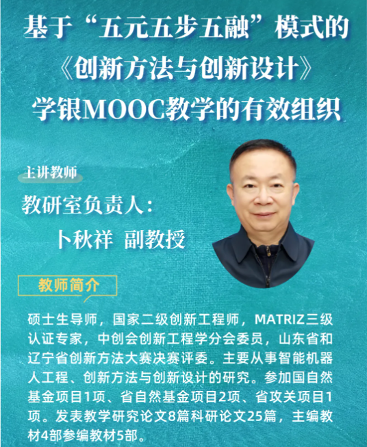 5月29日(星期三)下午16:00,将由青岛科技大学卜秋祥副教授、夏琳老师一起分享题为“基于‘五元五步五融’模式的《创新方法与创新设计》学银MOOC教学的有效组织”的报告。